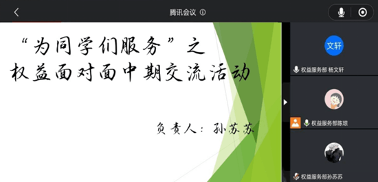 此次活动重在树立维权意识,合理进行维权。参与者利用腾讯会议进行交流,部门负责人为大家解答生活住宿、餐厅饮食、物业咨询管理等权益方面的问题。同学们积极向负责人反映了在学习和生活中遇到的各种权益类问题,如南操场厕所脏乱、教室多媒体使用故障等场地条件问题,宿舍里门窗经常损坏、饮水水费上涨、厕所脏乱等生活条件问题,部门负责人联系物业以及承包部门反映情况,得到相关部门在会议中回应与解决,未解决问题也向大家解释原因,增强了学生维护权益意识,促进校园和谐发展。