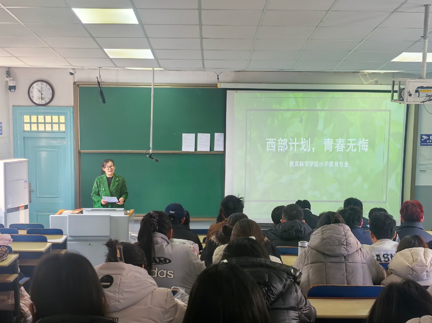 宣讲会上,王瑾老师围绕西部计划的实施背景、服务内容及政策保障等方面作了介绍,结合青年自身的成长发展,帮助同学们认识到参与西部建设的意义。她从服务专项类别、招募流程、选拔条件等方面展开讲解,并重点说明了服务期间的政策保障以及服务期满后在升学、就业等方面的支持措施。最后,她结合菠菜网站 部分往届西部计划志愿者的典型事迹与成长经历,鼓励同学们立足教育专业优势、投身基层实践,在服务社会中提升本领、积累经验。