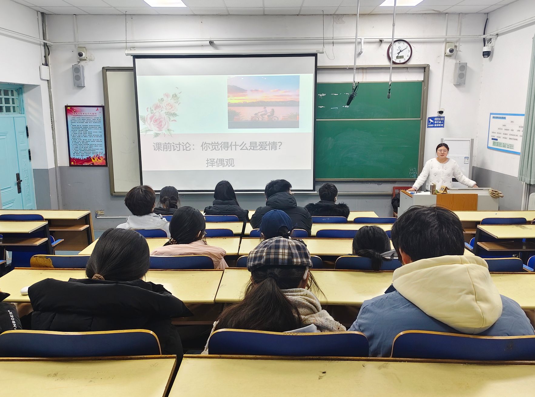 本次讲堂围绕“从懂爱到会爱”的主线展开。我校大学生心理健康教育与咨询中心研究生助理李云香首先结合爱情三元理论,系统解析了不同的恋爱模式,并通过古今案例阐释爱情与友情的区别,引导学生深化对恋爱本质的理解。随后,她结合同学们分享的实际经历,讲解了常见心理效应在恋爱关系中的具体表现,结合现实案例剖析其影响机制,引发了现场热烈讨论。最后,李云香强调了树立正确恋爱观的重要性,引导学生理性看待恋爱动机,并就异地恋维系、个人边界建立等实际问题提供了切实可行的建议,得到了同学们的广泛认同。